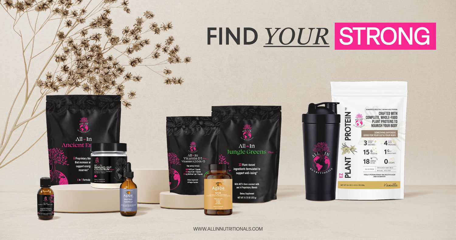 Welcome! We invite you to be ALL-IN and join us on this JOURNEY to Find Your Strong! Here at All-In Nutritionals™, we believe that being healthy doesn’t have to be complicated or a struggle. In our opinion, simple goes a long way, but you still have to be willing to do the work. It’s all about educating yourself, using knowledge as power, and making smart and strong, positive changes. We hope and plan to provide real-life, day-to-day strong strategies and motivation. You will love our masterfully formulated, strong supplements and deep dives into relevant information that can be used in your own journey to STRONG, optimal health. It’s all about constant, never-ending improvement and learning how to properly CLEANSE, NOURISH, PROTECT, AND BALANCE the body. So, let’s get started and Find Your Strong! We love to help and we’re pretty darn good at what we do!