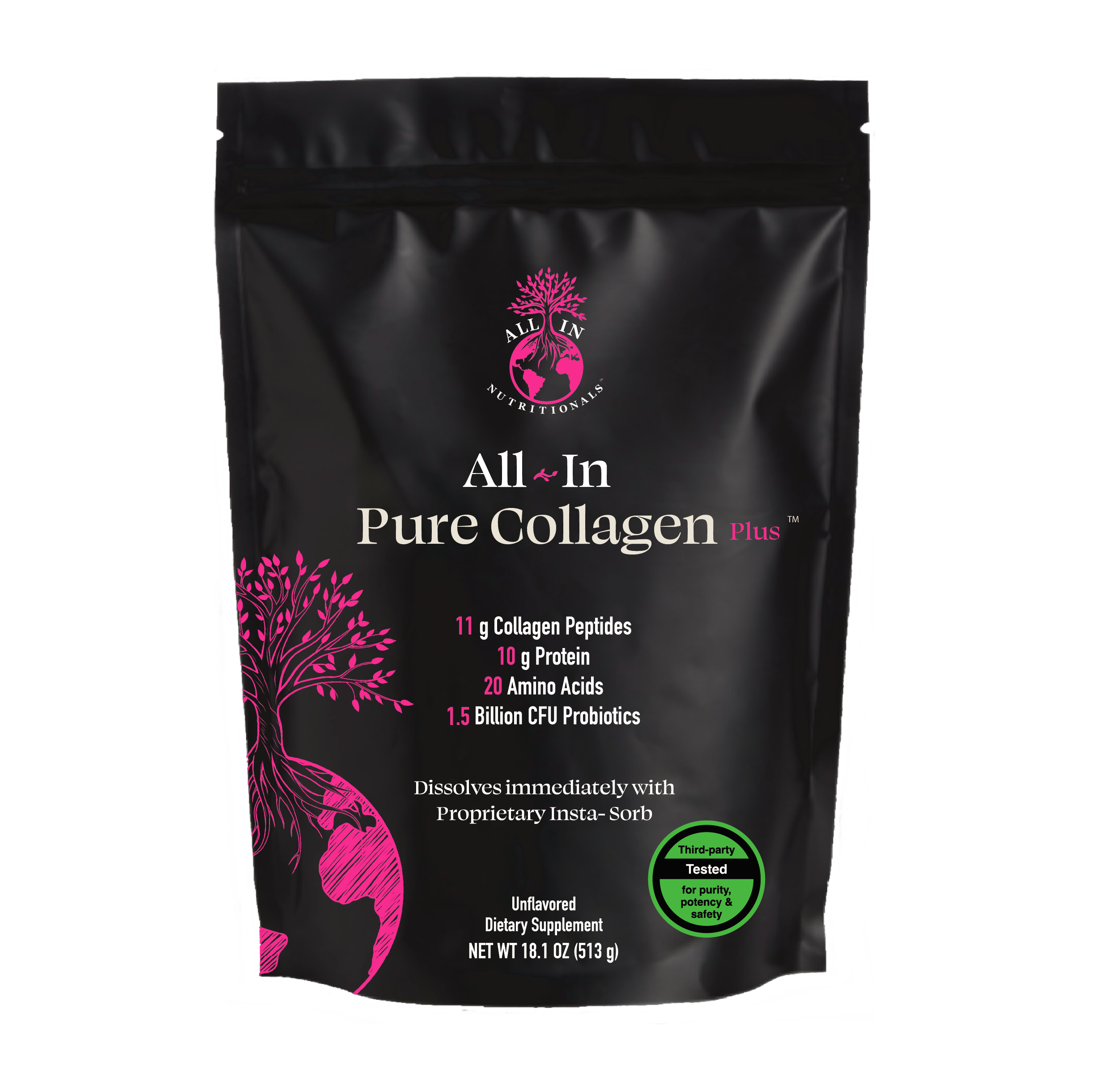Learn MoreAll-In Nutritionals™ is proud to offer a truly one-of-a-kind, pure, potent and clean Collagen with Probiotics delivered to your door in a beautiful, resealable pouch.